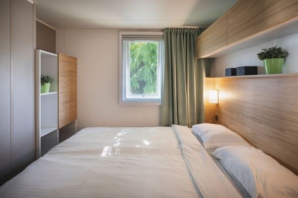 In dezelfde ruimte als de keuken bevindt zich de woonkamer. Er staat een vaste, ruime tafel met daaraan 6 stoelen zodat je op de frissere avonden in het voor- of naseizoen lekker binnen kunt eten. De hoekbank is voorzien van stevige kussens en een ideale plek om je favoriete serie te kijken op de flatscreen satelliet televisie. Je hoeft geen programma te missen tijdens je vakantie want alle belangrijke Nederlandse zenders zijn te ontvangen! Ga je met 7 personen op vakantie? De hoekbank kan gemakkelijk uitgeklapt worden om een extra slaapplaats te creëren (de bank is niet uitklapbaar op camping Cala Canyelles).