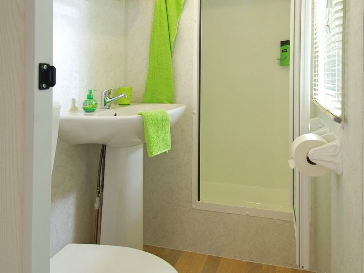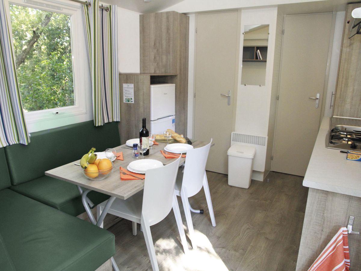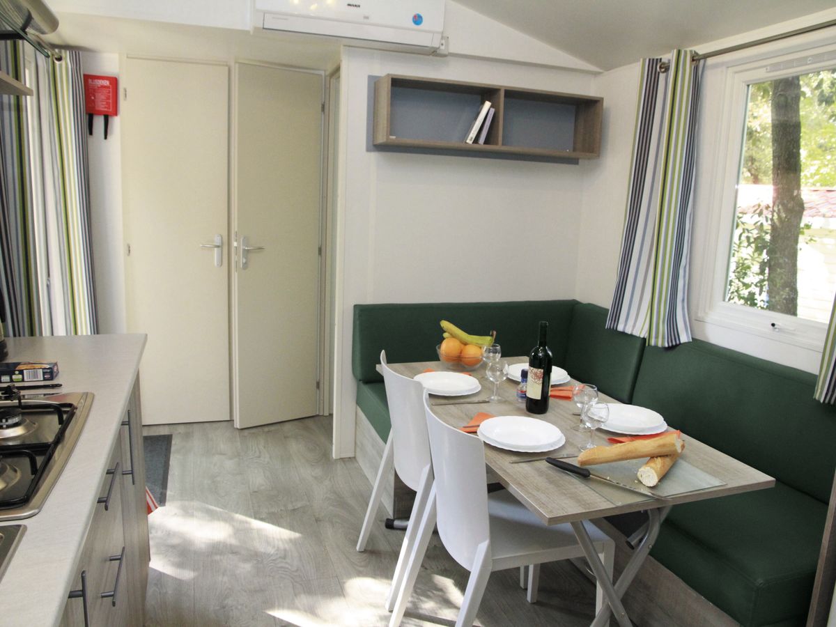 In de centrale woonkamer vind je een eethoek met comfortabele banken. Hier hangt ook de airconditioning. De keuken is compleet ingericht. Er staat een hoge koelkast met een apart vriesgedeelte, een aanrecht met een 4-pits gasstel, veel kastruimte en natuurlijk warm en koud stromend water. De badkamer heeft een lekker ruime douchecabine met douchedeur, een toilet en wastafel met warm en koud stromend water.