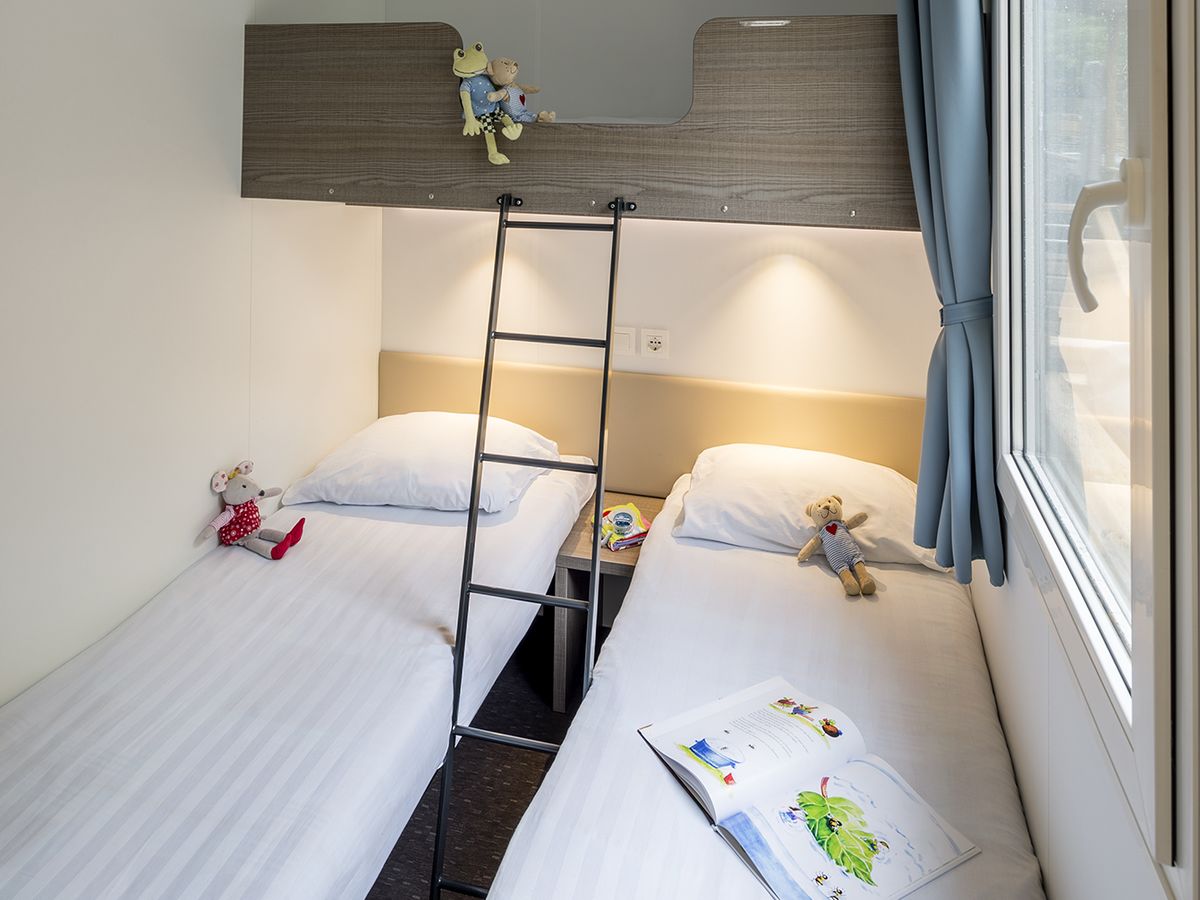 De Comfort is voorzien van 2 slaapkamers. Het tweepersoonsbed in de ouderslaapkamer is maar liefst 2.00 x 1.40 mtr.! Afhankelijk van de camping zijn in de kinderslaapkamer een éénpersoonsbed en een stapelbed (max 75 kg.) of twee éénpersoonsbedden en een bed overdwars op hoogte voor een kind. Voor de kleintjes is er een apart bedrekje aanwezig, die onze medewerker je kosteloos kan verstrekken. Op een aantal campings wijkt de indeling van de kinderslaapkamer af en is hier alleen een stapelbed. Er kan eventueel één klein kind op de bank in de woonkamer slapen. Alle stacaravans zijn voorzien van muggenhorren in de slaapkamers. In alle stacaravans hebben wij al voor 1-persoonsdekbedden en kussens gezorgd.