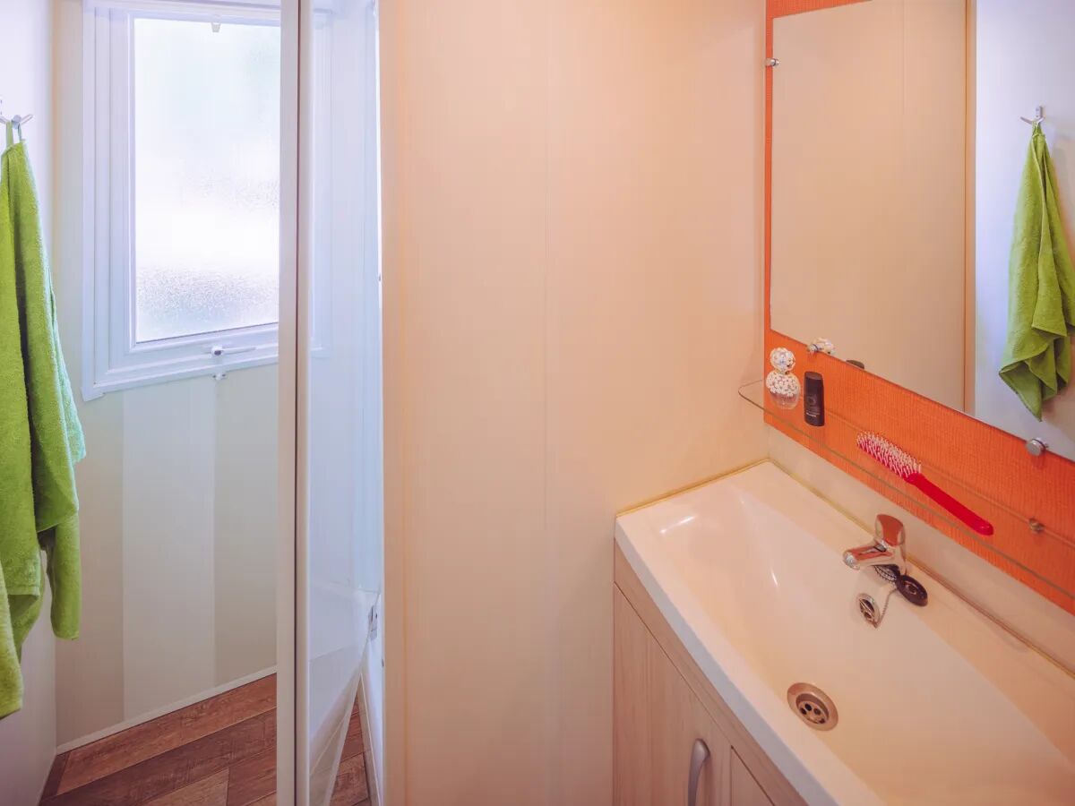 In de ruime woonkamer met airconditioning vind je een zithoek en keuken. De keuken is voorzien van een vaatwasser, hoge koelkast met apart vriesgedeelte, magnetron, waterkoker, 4-pits gasfornuis en een koffiezetapparaat. Je kunt vanaf de zithoek ontspannen tv kijken op de aanwezige satelliet-TV met alle belangrijke Nederlandse zenders. Zo weet je zeker dat je niets zult missen van jouw favoriete (sport)programma’s. De kleintjes zullen zeker blij zijn met hun Nederlandse kindertelevisie. De badkamer is voorzien van een ruime douchecabine en wastafel met grote spiegel en er is een apart toilet aanwezig.