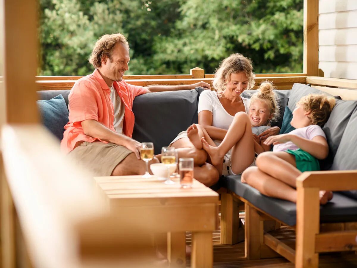 De houten veranda is overdekt en maar liefst 20 m2. Met de Roan sunbanner kun je altijd schaduw onder de overkapping creëren, hier staat ook een luxe tuinset voor je klaar. Op de andere kant van de veranda staat een mooie tweepersoons loungebank met comfortabele kussens en een bijzettafeltje. Op de campingpagina kun je lezen over welke gratis barbecue/grillplaat jouw accommodatie beschikt.