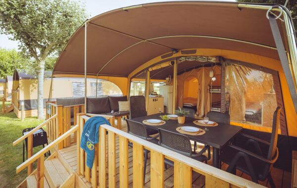 Bij een glamping vakantie in een Roan lodgetent kun je een volledig ingerichte tent verwachten met fijne bedden, een overdekte houten veranda, volledig inventaris en veelal een luxe loungebank!