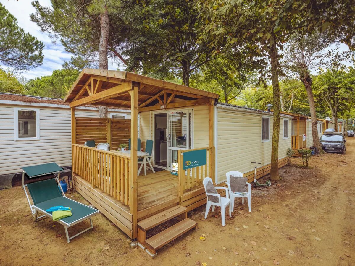 Vanuit de woonkamer loop je via de brede deur de luxe houten veranda op waar de tuinstoelen al op je staan te wachten. De veranda is overdekt, zodat je altijd in de schaduw kunt zitten. En dat is op jouw zomerse vakantiebestemming natuurlijk wel zo prettig! Om wat extra privacy of schaduw te creëren hangt er standaard een sunbanner. Op de campingpagina kun je lezen over welke gratis barbecue/grillplaat jouw accommodatie beschikt.