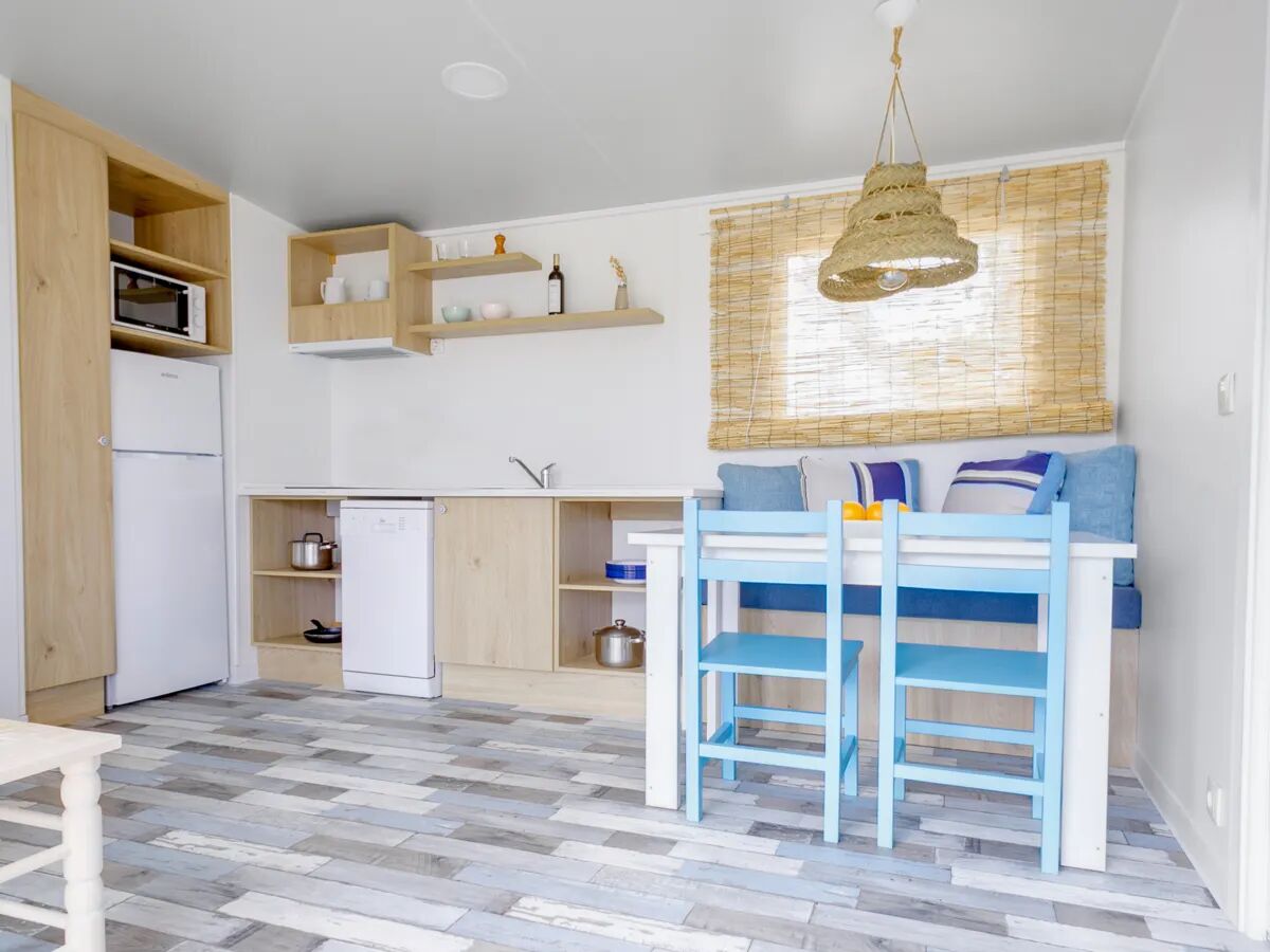 De keuken is standaard voorzien van een koelkast met apart vriesvak, een fornuis, magnetron, Nespresso koffiezetapparaat, waterkoker, een uitgebreide keukeninventaris en een vaatwasser. In de woonkamer hangt een satelliet televisie. Voor extra comfort is deze stacaravan voorzien van 2 badkamers. Een badkamer is ensuite aan de tweepersoonsslaapkamer en beschikt over een wastafel, ruime douchecabine en toilet. De andere badkamer is ensuite aan de kinderslaapkamer en beschikt over een wastafel, ruime douchecabine en toilet