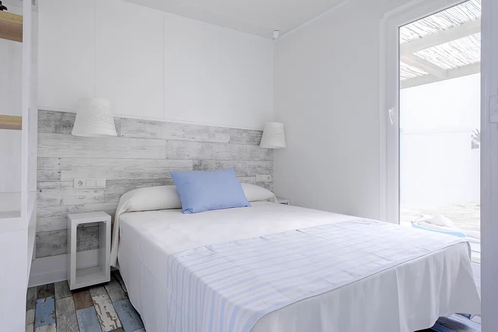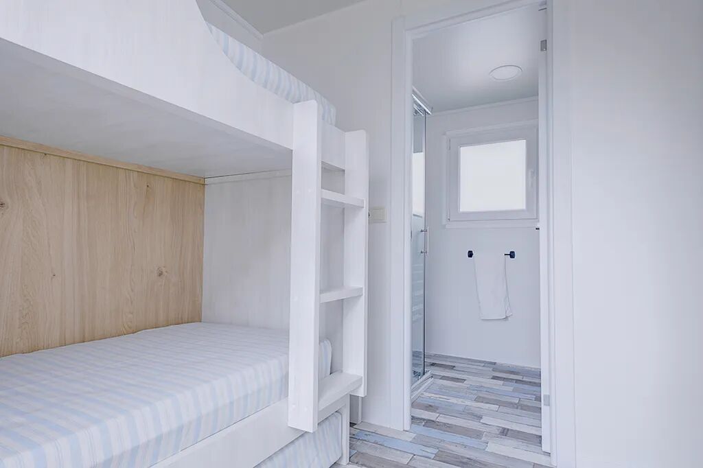 Deze luxe stacaravan beschikt over 2 slaapkamers. In de ouderslaapkamer staat een tweepersoonsbed en in de 2e slaapkamer staat een stapelbed (max. gewicht 70 kg) met een extra uitschuifbed. In iedere stacaravan is standaard 1 bedrekje aanwezig.